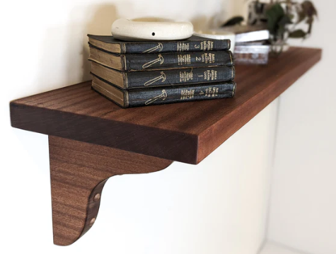 with wood brackets. This solid wood shelf, paired with rich mahogany