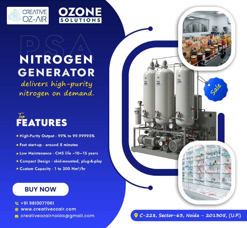 A PSA Nitrogen Generator produces high-purity nitrogen directly from compressed air using Pressure Swing Adsorption technology. It offers a continuous, safe, and cost-effective nitrogen supply witho...