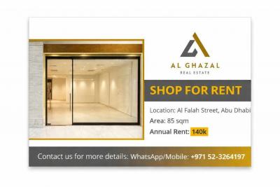 (Al Falah Street , Abu Dhabi)  - Housing, Real Estate / Commercial Shop for Rent Location: Al Falah Street, Abu Dhabi Area: 85 sqm Annual Rent : 140k Contact us for more details WhatsApp/Mobile: +971 52-3264197