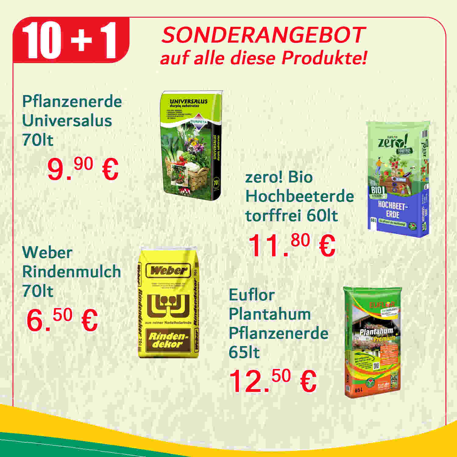 Kaufe 10x Universalerde Universalus 70 L und erhalte 1 GRATIS dazu! 🚀Kaufe 10x zero! Bio-Erde für Hochbeete 60 L und erhalte 1 GRATIS dazu! 🚀Kaufe 10x Rindenmulch Weber 70 L und erh...