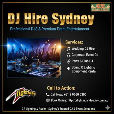 Looking for professional DJ services in Sydney? CR Lighting & Audio is your trusted partner for all events – weddings, corporate events, birthday parties, and nightclub gatherings.We provide:Wed...
