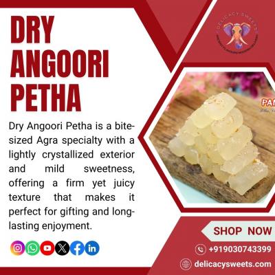 Dry Angoori Petha is a bite-sized Agra sweet with a firm, lightly crystallized texture and mild sweetness. Made from ash gourd using traditional methods, it is ideal for gifting, travel, and longer sh...