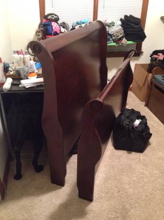 I'm selling my sleigh bed for queen size mattress. Excellent condition. Matching wooden bed frames are included. $90 obo.