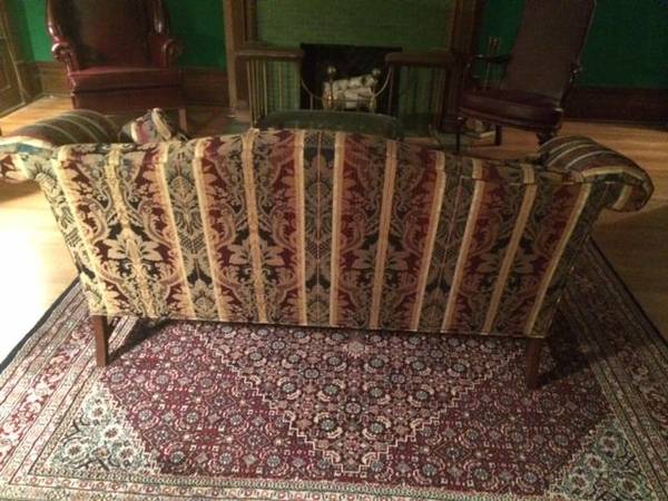 Elegant, camel back love seat in jewel toned brocade.