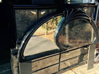 This 4 piece bedroom set is a marbled black/grey , high gloss, onyx,