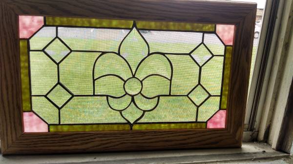 French vintage Fleur-de-lis transom stained glass window. Framed in