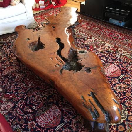 Solid redwood table. Rustic and beautiful. Longest length about 95".