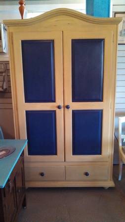 Hand painted armoire, spaceous enough to hang clothes or use as entertainment center. Navy and mustard yellow.