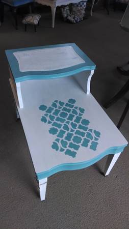 Vintage two tiered accent table painted in old white and provence blue chalk paint.