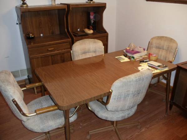 The table is in nice condition and you can have either straight back chairs or chairs on rollers.