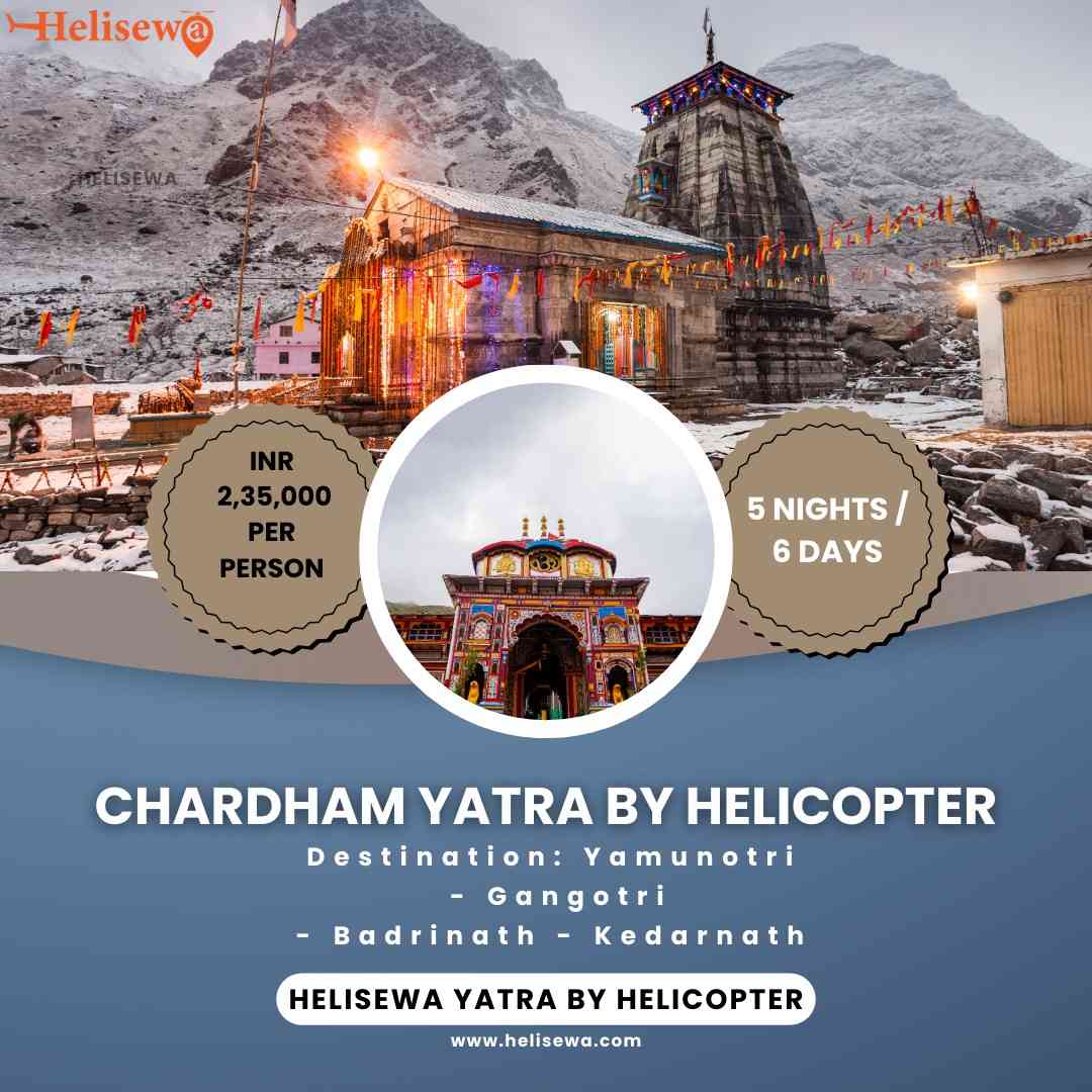 Embark on the sacred journey of a lifetime with Helisewa's exclusive Char Dham Helicopter Services to Kedarnath, Badrinath, Gangotri, and Yamunotri. Our helicopter packages are fast, safe and luxu...