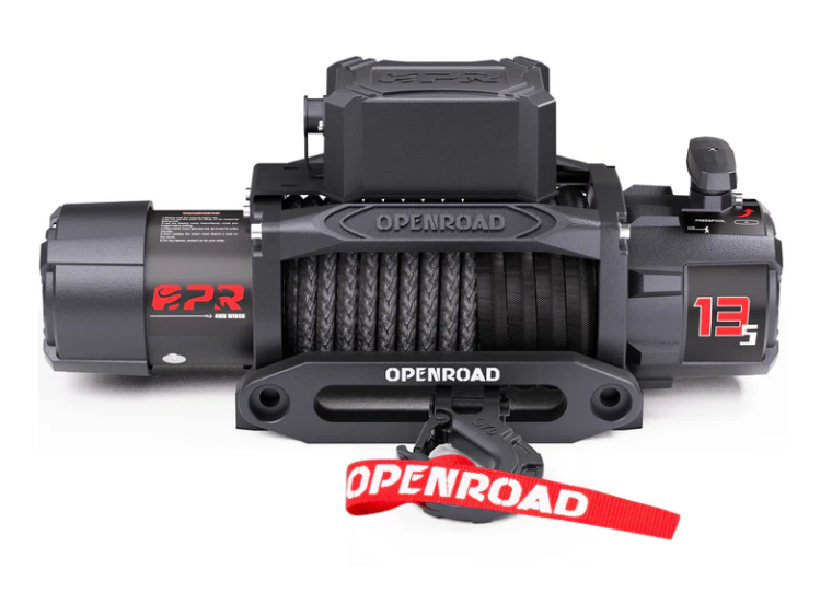 The OPENROAD winch with synthetic rope excels in off-road recovery. This heavy-duty winch can pull 12,000