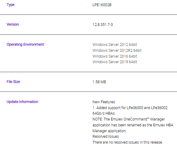 New Features1. Added support for LPe36000 and LPe36002 64Gb/s HBAs.NOTE: The Emulex OneCommand™ Manager application has been renamed as the Emulex HBA Manager application.Resolved IssuesThere are no...