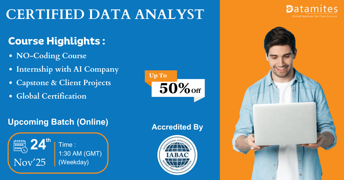 DataMites, a leading Data analyst Institute in Hyderabad, offers training in Data analyst, Machine Learning, Python, Tableau, Deep Learning, and Artificial Intelligence. The Certified Data analyst Pro...