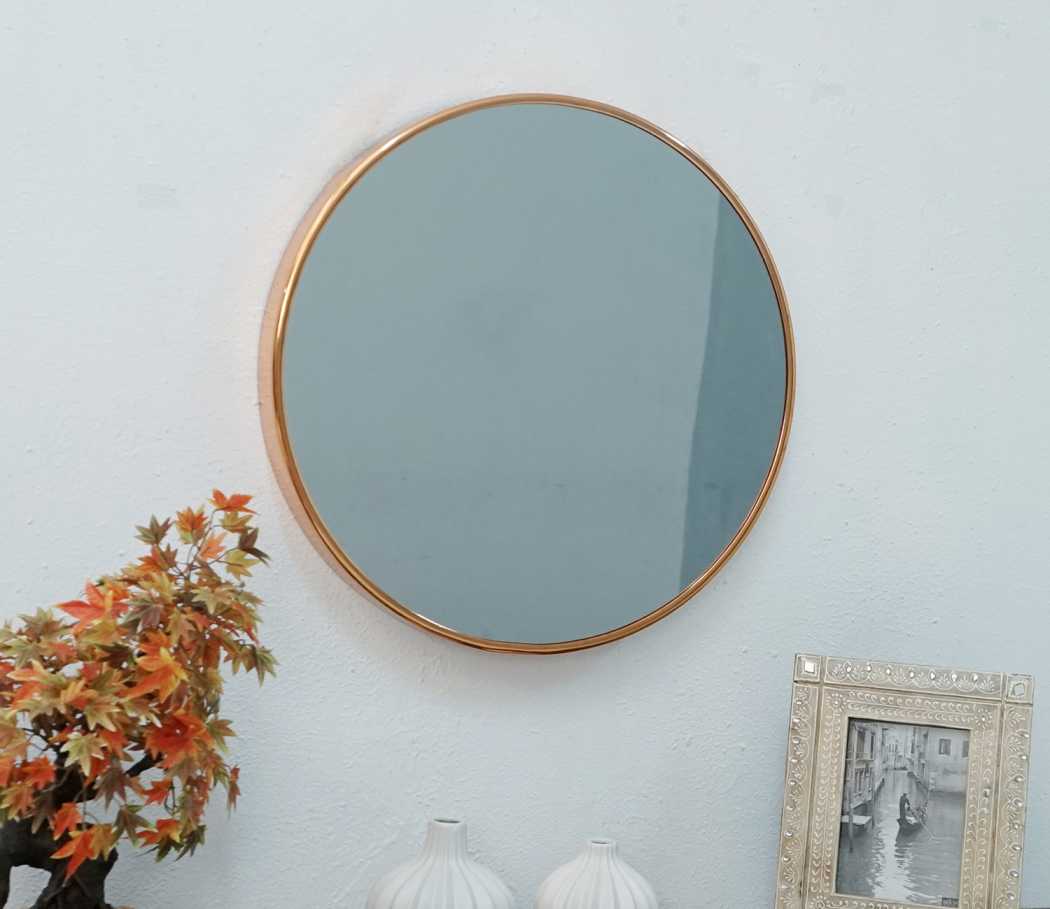 Transform your interiors with the Shimmering Round Metal Wall Mirror. Designed with a radiant rose gold frame, this mirror creates an eye-catching focal point in any room.