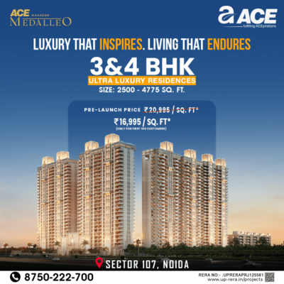 Ace Medalleo is a landmark ultra-luxury residential development in Sector 107, Noida, offering premium 3 & 4 BHK apartments, duplexes, and independent floors. Spread across 10 acres, the project p...