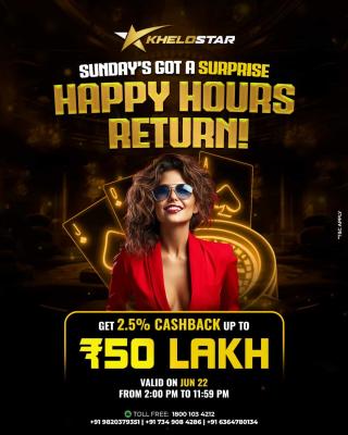 Khelostar Sports Happy Hours – Play & Win This Sunday Khelostar is making this Sunday exciting for online gaming and sports lovers! The site brings back its special Happy Hours offer on June 22 from 2 PM to 11:59 PM. Get 2.5% cashback, up to ₹50 Lakh, ...