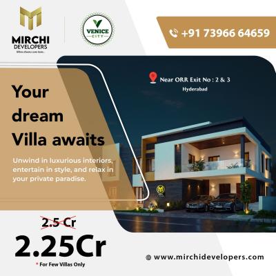 Discover a new standard of luxury living with Venice City by Mirchi Developers. Located near ORR Exit 2 & 3, Hyderabad, these stunning villas offer elegance, comfort, and modern design for familie...