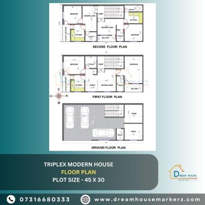 Explore a stylish triplex modern house plan designed for a 45 x 30 plot (1350 sq ft) in Jabalpur, Madhya Pradesh. Dream House Makerz brings you expert house designers who focus on smart planning and m...