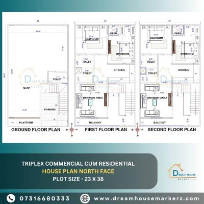 Experience the perfect blend of business and living with this triplex commercial cum residential house plan for a 23 x 38 north-facing plot in Darbhanga, Bihar. Dream House Makerz, a trusted online ar...