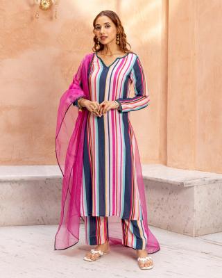 Brighten up your ethnic wardrobe with this vibrant multicolour suit set for women from Ambraee. The playful stripes and breathable fabric bring together comfort and charm, perfect for festive gatherin...