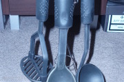 2 black plastic spoons, one bigger than the other, a potato masher and