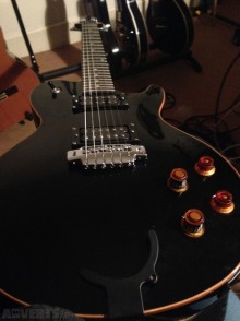 Single cutaway- carved maple top- floating cream scratchplate- cream body binding- 22 fret maple neck- rosewood fingerboard- trapeziodal neck inlays- Chrome hardware- twin humbuckers- 3-a-side closed ...